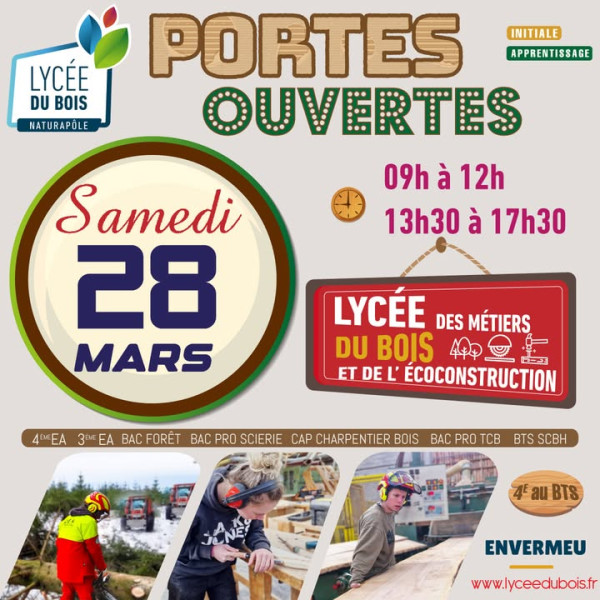 [SCOLAIRE] Vous vous intéressez aux métiers du bois et de l’éco-construction Ne manquez pas les Portes Ouvertes du Lycée des Métiers du Bois d'Envermeu. 📅 Samedi 28 mars 🕘 09h à 12h 🕜 13h30 à 17h30👉 Formations en apprentissage et en initiale👉 Du collège au BTS :4e EA • 3e EA • Bac Forêt • Bac Pro Scierie • CAP Charpentier Bois • Bac Pro TCB • BTS SCBHUne belle occasion de :✅ Découvrir des métiers passionnants✅ Échanger avec les enseignants et les élèves✅ Visiter les ateliers et équipements🌿 Un établissement qui forme aux métiers d’avenir, au cœur de notre territoire !📲 Plus d’informations : www.lyceedubois.fr#PortesOuvertes #Formation #MétiersDuBois #ÉcoConstruction #Orientation #Envermeu