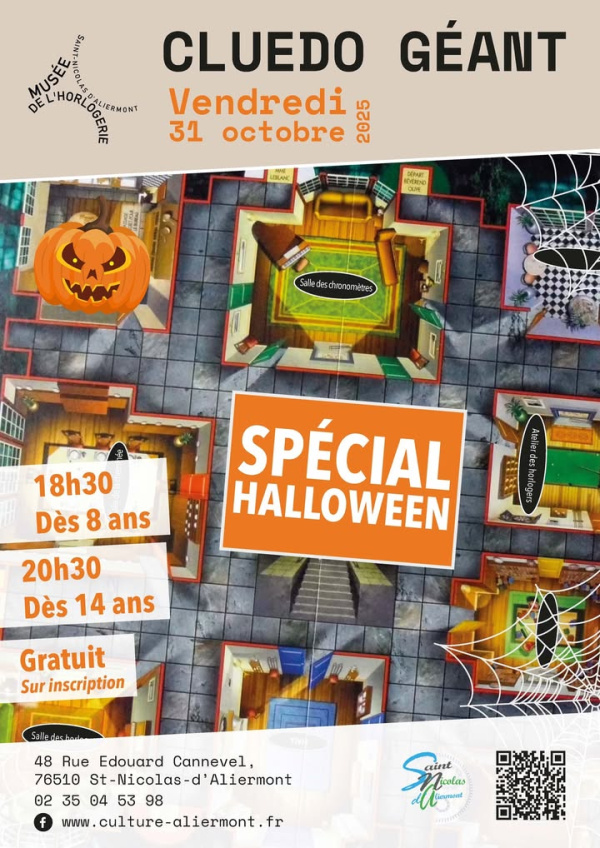 [JEU GÉANT] ️♀️ Cluedo géant spécial Halloween au Musée de l’Horlogerie ! Le mystère s’installe au musée… Saurez-vous résoudre l’enquête avant qu’il ne soit trop tard ️ Vendredi 31 octobre 🕠 1ère session à 18h30 – dès 8 ans🌙 2e session à 20h30 – dès 14 ans📍 Musée de l’Horlogerie – Saint-Nicolas-d’Aliermont💥 GRATUIT – Places limitées !👉 Inscrivez-vous vite pour vivre une soirée pleine de frissons, d’indices et de suspense en famille ou entre amis !#SaintNicolasdAliermont #MuseedelHorlogerie #Halloween2025 #CluedoGéant #SortieFamille #Jeu #Mystère