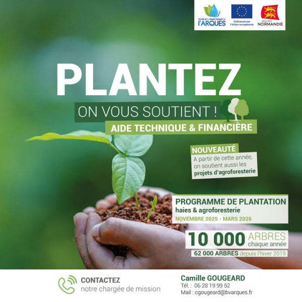 [ENVIRONNEMENT] Chaque automne, le Syndicat Mixte du Bassin Versant de l’Arques (SMBV Arques) relance son programme de plantation de haies ! Vous êtes habitant, agriculteur ou professionnel et souhaitez planter une haie Pour la campagne 2025-2026, le SMBV Arques vous accompagne de A à Z avec :✅ Une aide financière jusqu’à 80 % du montant TTC (plafond variable selon le projet)✅ Un kit de plantation complet : arbres, arbustes, tuteurs, protections, paillage biodégradable✅ Un accompagnement technique et administratif personnalisé✅ La livraison des plants sur site ou retrait possible chez le fournisseur✅ La possibilité d’intégrer une entreprise pour la plantation ou le travail du sol🌾 Nouveauté 2025-2026 : les projets d’agroforesterie (plantations en intra-parcellaire) sont désormais éligibles !💡 Pourquoi planter des haies ?Les haies :🌱 Favorisent la biodiversité💧 Protègent les ressources en eau🌬️ Réduisent la sécheresse des sols🔥 Soutiennent la filière locale de bois énergie🍃 Captent du carbone et embellissent nos paysagesPlus d’informations sur les détails du programme, les conditions… sur notre site internet : https://www.bvarques.fr/nos-actions/limiter-l-%C3%A9rosion-et-le-ruissellement-agricole/plantation-de-haies/
