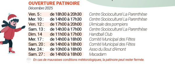 [PATINOIRE] Bonne nouvelle ! La patinoire est ouverte aujourd’hui de 14h à 17h30 ! Et en plus… pas de pluie au programme ️ Parfait pour venir glisser et partager un moment convivial. ⛸️ Petits et grands, on vous attend nombreux pour profiter de l’après-midi !