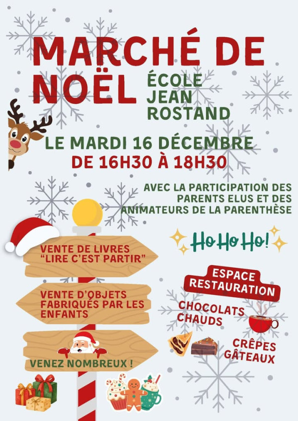 [ÉVÈNEMENTS] Le marché de Noël de l’école Jean Rostand, c’est mardi prochain dès 16h30 ! Venez découvrir les créations des enfants et partager un moment convivial. 👉 Profitez-en pour poursuivre votre fin d’après-midi au Centre Socioculturel La Parenthèse et contribuer à la construction du programme 2026-2027 : activités, loisirs, actions… vos idées comptent !✨ Un mardi 16 décembre riche et chaleureux vous attend !