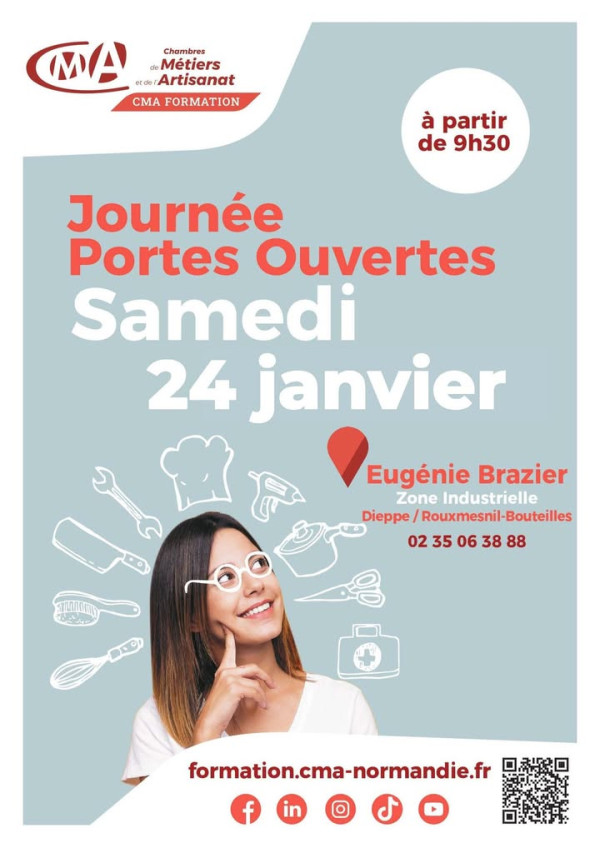 [PORTES OUVERTES] Le CMA FORMATION Eugénie BRAZIER vous invite à sa Journée Portes Ouvertes ! 🗓 Samedi 24 janvier 2026 à partir de 9h30📍 CMA FORMATION – Site Eugénie BRAZIER, ZI Louis Delaporte, Voie E – Zone Marron, BP 701, 76370 Rouxmesnil-Bouteilles👉 Cette journée est l’occasion pour les jeunes, leurs familles et les acteurs locaux de :• Découvrir nos formations en alternance,• Visiter nos infrastructures modernes,• Rencontrer nos équipes pédagogiques et apprentis.💡 Venez poser vos questions et préparer votre avenir dans un cadre convivial et professionnel !