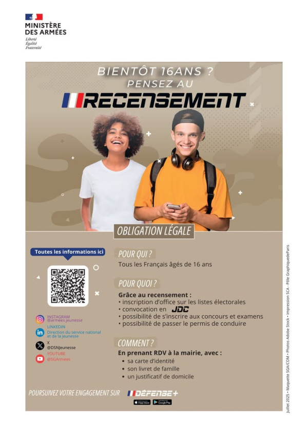 [JEUNES] Le recensement, c’est à 16 ans ! Obligatoire, il vous permet ensuite de : ✅ vous inscrire aux examens✅ passer le permis de conduire✅ vous inscrire sur les listes électorales🕒 Pas besoin de rendez-vous, présentez-vous directement en mairie, aux horaires d’ouverture, avec 🪪 une carte d’identité📘 le livret de famille🏠 un justificatif de domicileUn petit geste maintenant pour être tranquille plus tard ! ✔️