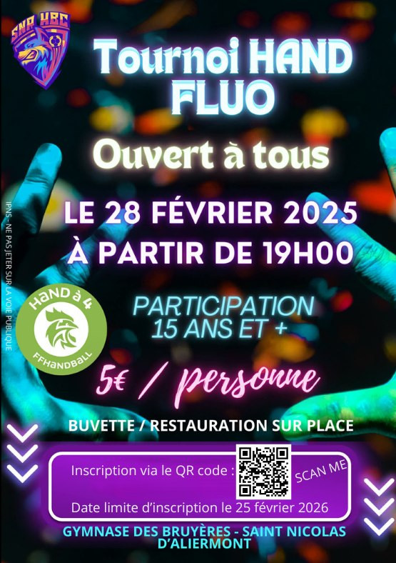 [ASSOCIATION] ♂️✨ Le SNA HBC renouvelle son tournoi de Hand Fluo !📅 Samedi 28 février à partir de 19h💡 Ambiance fluo garantie !👥 À partir de 15 ans💰 5 € par personneVenez vous amuser, faire du sport et partager un moment fun et convivial 💚🖤On vous attend nombreux ! 🔥🤾♀️