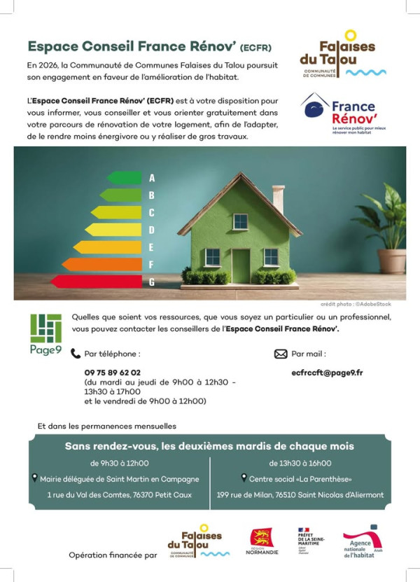 [HABITAT] Vous avez un projet de rénovation Dans le cadre de l’Espace Conseil France Rénov’ (ECFR) mis en place par la Communauté de communes Falaises du Talou, les habitants du territoire peuvent bénéficier d’un accompagnement gratuit et personnalisé. 👉 Travaux d’économies d’énergie👉 Adaptation du logement👉 Gros travaux ou projet de rénovation globaleDes conseillers sont à votre écoute pour vous informer, vous orienter et vous accompagner dans vos démarches.La Communauté de Communes Falaise du Talou poursuit ainsi son engagement en faveur de l’amélioration de l’habitat en 2026.